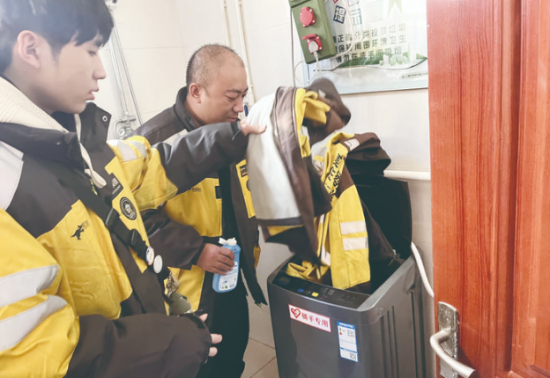 1月19日一早,記者走進(jìn)服務(wù)驛站時(shí),已有幾位騎手在此休息。干凈整潔的床鋪、沙發(fā)、桌椅,晾衣架、飲水機(jī)、微波爐、礦泉水、應(yīng)急藥品等一應(yīng)俱全!斑@個(gè)服務(wù)驛站特別好,旁邊就是美團(tuán)的工作站點(diǎn),每天開完早會(huì)或者不忙時(shí),我們都會(huì)來(lái)這休息,吃個(gè)飯、喝口水,告別風(fēng)餐露宿。衣服臟了還可以用洗衣機(jī)洗,特別省心,就像家一樣!蓖赓u員郭蕊說(shuō)。
