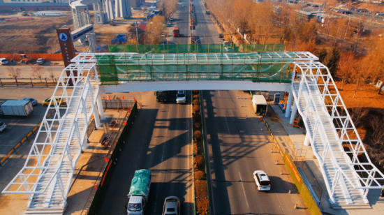 據(jù)悉,本項目天橋總體采用“匚”字型布局,主體結(jié)構上跨黑大公路。主橋設計全長38米,全寬4米。橋梁上部結(jié)構采用單箱單室鋼箱梁,梁高1.8米,結(jié)構穩(wěn)固。橋梁兩側(cè)各布置1道人行梯道,梯道寬度為4米,單個梯道長度約18.05米,便于行人上下。