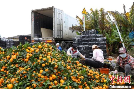 1月5日,在廣西南寧市西鄉(xiāng)塘區(qū)壇洛鎮(zhèn)同富村,村民分揀剛采摘的砂糖橘。眼下正是砂糖橘成熟的季節(jié),當?shù)剞r(nóng)民忙著采摘上市。(資料圖) 中新社記者 王偉臣 攝