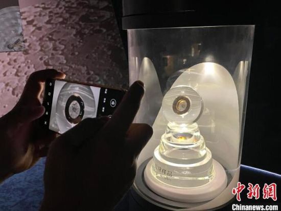 2021年7月17日,全球建筑規(guī)模最大的天文館——上海天文館開館。當(dāng)天的開館儀式上,與會(huì)嘉賓為“天外來(lái)物”——月壤入館揭幕。該部分月壤樣品被封裝在水晶球中,供觀眾近距離觀看。(資料圖) 中新社記者 鄭瑩瑩 攝