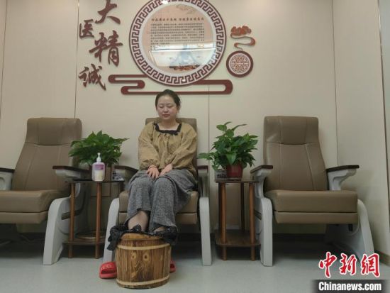 2月15日,在吉林省吉林市,一位滑雪客正在用中藥泡腳!≈行律缬浾 石洪宇 攝