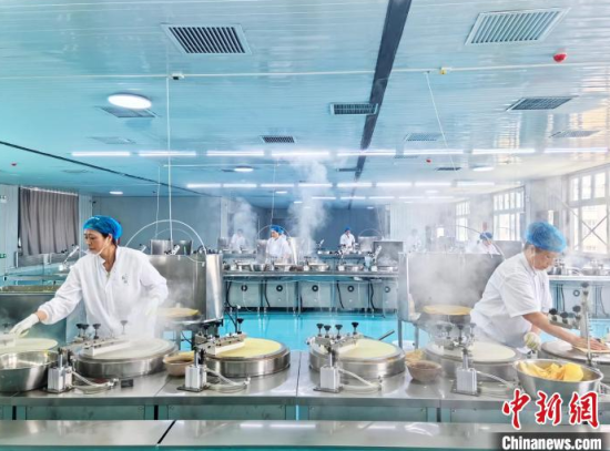 4月16日,在吉林省樺甸市的一家企業(yè)里,工人們正在制作煎餅。 中新社記者 蒼雁 攝