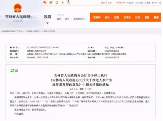 日前,吉林省人民政府辦公廳發(fā)布《吉林省人民政府辦公廳關于停止執(zhí)行<吉林省人民政府辦公廳關于推進人參產業(yè)高質量發(fā)展的意見>中相關措施的通知》(下稱《通知》)。