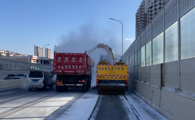 李文秀介紹,早高峰結束后,次要街路立即啟動全面清雪作業(yè);針對快速路及主要街路路面積雪已被車輛壓實的情況,已第一時間采取融冰融雪處置措施,于中午12時以后啟動反復清掃作業(yè),同步調配運雪車輛開展邊清邊運,最大限度降低路面積雪存量。