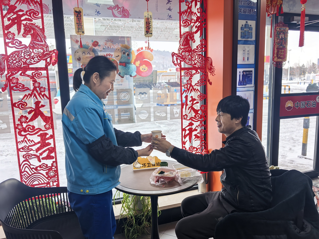 吉林市分公司磐石煙筒山站內(nèi),紅燈籠錯落懸掛,節(jié)日商品琳瑯滿目,休息區(qū)姜茶暖香四溢。“師傅,您跑長途返鄉(xiāng),胎壓有點偏低,需要幫忙調(diào)整嗎?”加油員一邊加油,一邊細心提醒,細致服務(wù)贏得司機連連道謝。