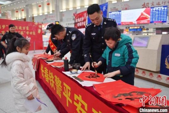 沈陽鐵路公安局長春公安處的民警在為旅客送福字。張瑤 攝