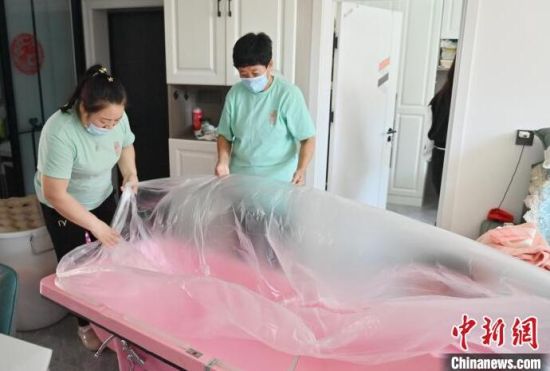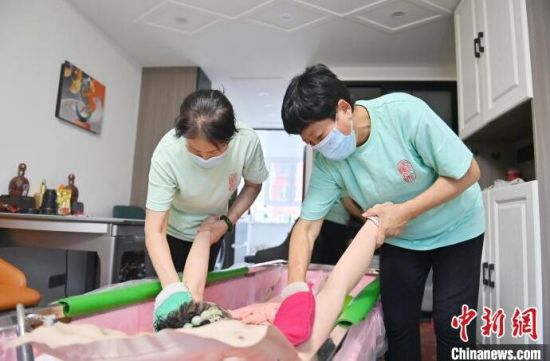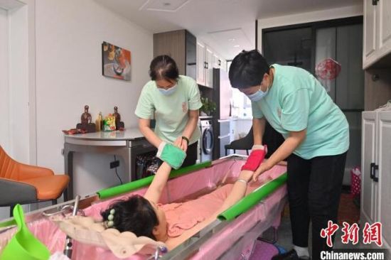 4月30日,吉林長春,助浴師在為老人洗澡。近來,針對行動不便老人的助浴服務(wù)在長春悄然興起,在長春工作的助浴師們“五一”國際勞動節(jié)期間訂單已排滿。(完)