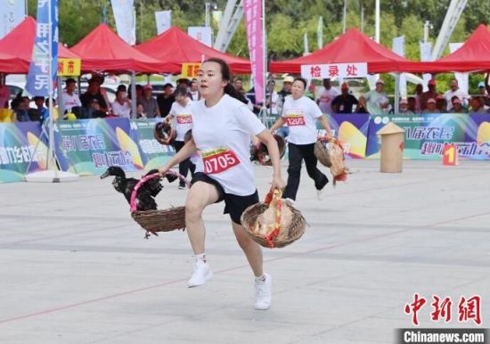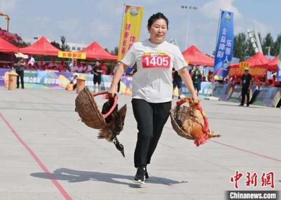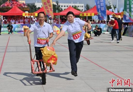 8月16日,吉林長(zhǎng)春,農(nóng)民趣味運(yùn)動(dòng)會(huì)在長(zhǎng)春農(nóng)博園精彩上演,運(yùn)動(dòng)會(huì)設(shè)置了“喜獲豐收”“回娘家”“農(nóng)田大力士”等充滿鄉(xiāng)村特色的比賽項(xiàng)目。圖為選手在“喜獲豐收”比賽中。中新社記者 張瑤 攝