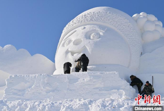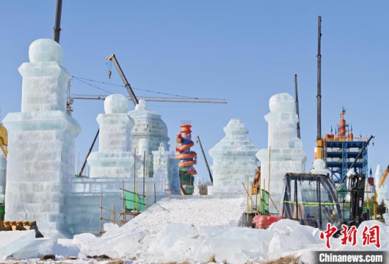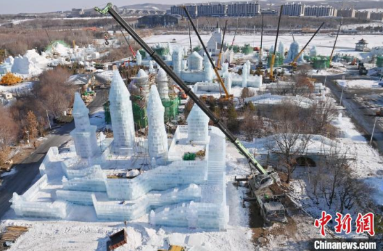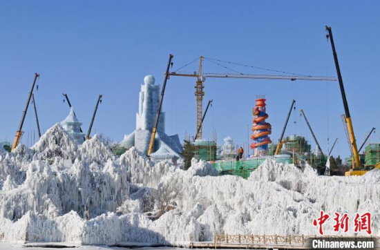 12月11日,吉林長春,工作人員正在長春冰雪新天地緊張施工。今年長春冰雪新天地總占地面積達(dá)到156萬平方米,冰雪雕塑200組創(chuàng)歷屆之最,并設(shè)置1314米的空中雪漂流、520米的冰滑梯等設(shè)施供中外游客游玩。中新社記者 張瑤 攝