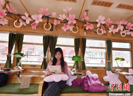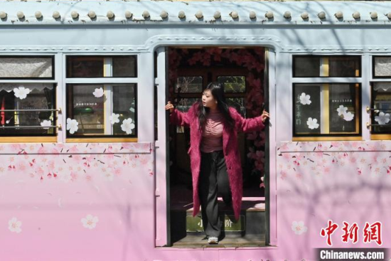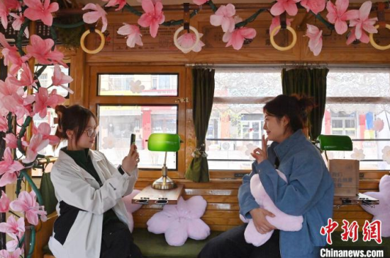 4月18日,吉林長(zhǎng)春,游客在54路文旅春日限定專(zhuān)列上拍照留念。該專(zhuān)列車(chē)廂內(nèi)外融入了桃花的設(shè)計(jì)元素,營(yíng)造出濃郁的春意,吸引了眾多游客前來(lái)打卡。中新社記者 張瑤 攝