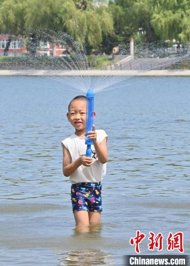 7月8日,吉林長春,小朋友來到南湖公園戲水避暑。長春的高溫“桑拿天”已持續(xù)多日,大批市民來到公園親水納涼。中新社記者 張瑤 攝