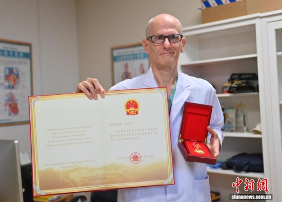 10月17日,吉林長春,意大利醫(yī)生拉瓦若展示患者送他的錦旗。十年前,他作為國際志愿者與長春結緣,被當?shù)貙iT救助貧困心臟病患者的“吉心工程”所打動,決定留下。近日,他榮獲中國政府友誼獎。他表示將繼續(xù)留在長春,培育青年醫(yī)生、優(yōu)化診療體系,讓更多患者擁有“心跳的力量”。中新社記者 張瑤 攝