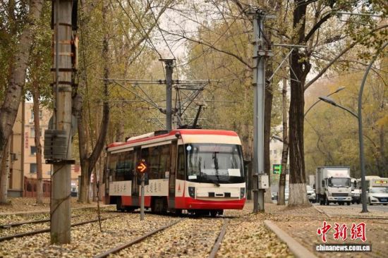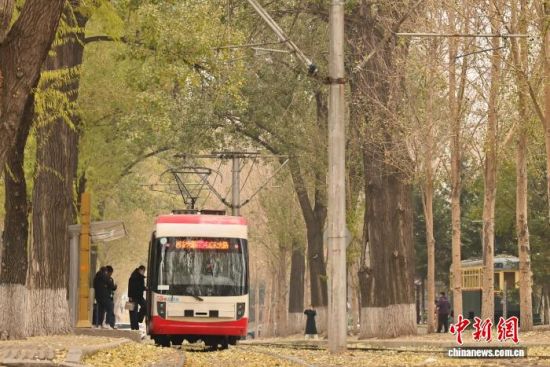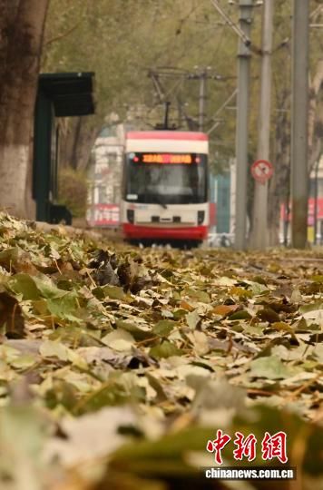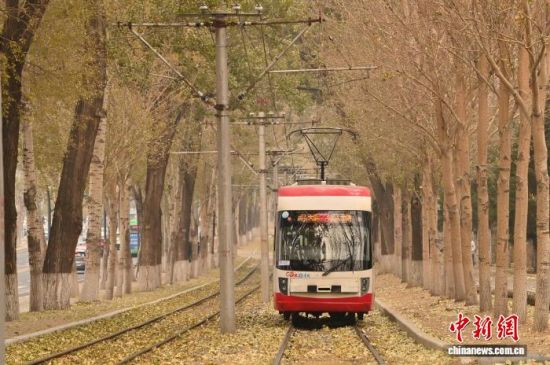 11月5日,吉林長春秋意正濃,一處軌道兩旁的樹葉泛黃,有軌電車宛如在畫中穿行。中新社記者 張瑤 攝