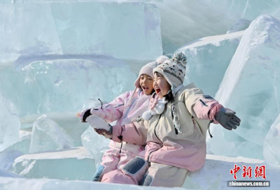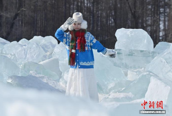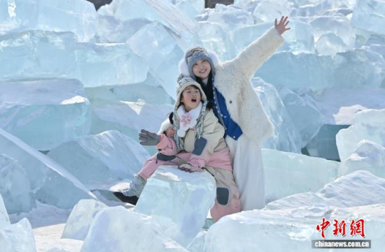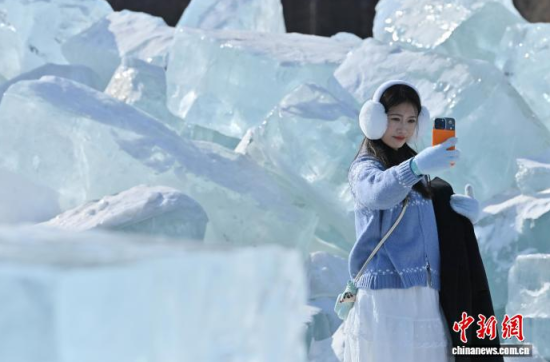 2月9日,在長(zhǎng)春凈月潭國(guó)家森林公園內(nèi),由水庫(kù)天然冰塊堆砌而成的“藍(lán)冰”景觀,吸引市民打卡拍照!八{(lán)冰”是指致密堅(jiān)硬的冰,因冰內(nèi)部空氣被擠掉而變得晶瑩透徹,這時(shí)陽(yáng)光中波長(zhǎng)較短的藍(lán)光被致密堅(jiān)厚的冰層散射,冰塊便呈現(xiàn)出水晶般美麗的藍(lán)色。中新社記者 張瑤 攝