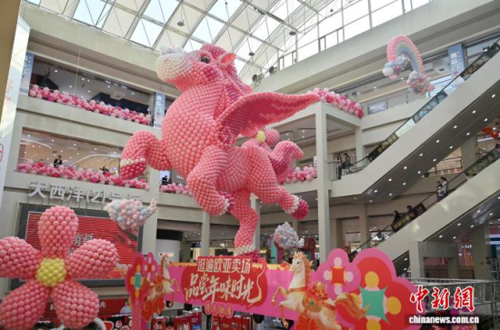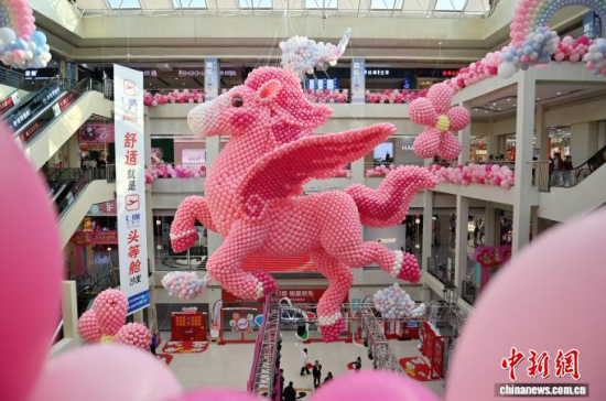 2月11日,吉林長春一商場內懸掛用8萬個氣球組成的“瑞馬迎春”裝置,迎接丙午馬年春節(jié)。中新社記者 張瑤 攝